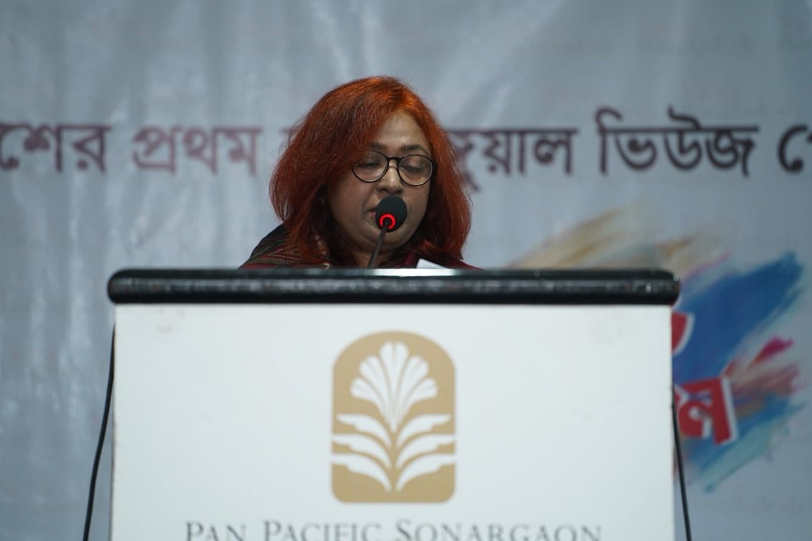 ভিউজ নেটওয়ার্কের চেয়ারম্যান শরীফা আখতার পক্ষে শুভেচ্ছা বক্তব্য পড়ে শোনান ডালিয়া নিলুফার।