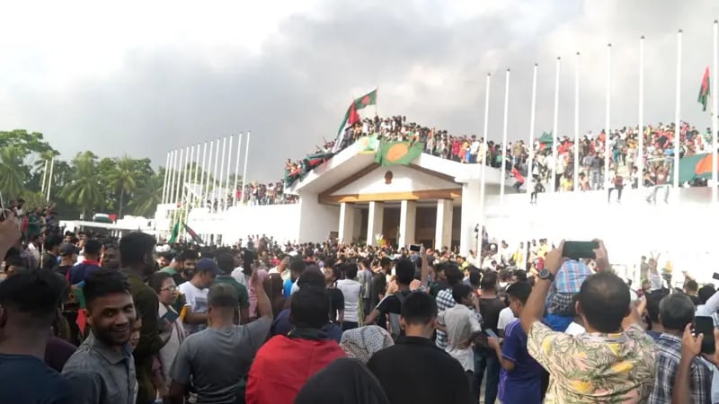 প্রধানমন্ত্রীর কার্যালয়ে ছাত্র-জনতার বিজয় উল্লাস। ছবি: এএফপি