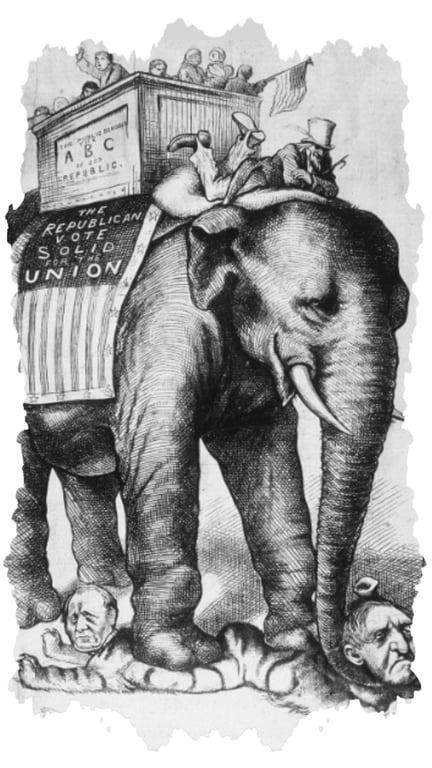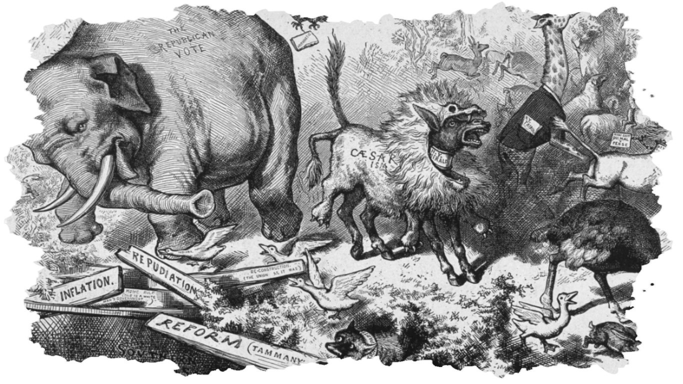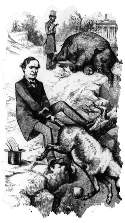 ভালো কথা। মজার ব্যাপার হলো এর কিছুদিন পর থমাস ন্যাস্ট আরেকটি কার্টুন আঁকেন। এই কার্টুনের বিষয়বস্তু হলো: সিংহের চামড়া পিঠে চাপিয়ে একটি গাধা বনের সব প্রাণীকে ভয় দেখাচ্ছে। সিংহের ছদ্মবেশী সেই গাধাকে দেখে সবাই ভয়ে পালাচ্ছে; কিন্তু সবাই ভয়ে পালালেও বনে একটি হাতি অসীম সাহস নিয়ে বুক চিতিয়ে দাঁড়িয়ে আছে। হাতির এই নির্ভীক ভঙিটা প্রতীক হিসেবে গ্রহণ করলেন রিপাবলিকরা। অর্থাৎ ডেমোক্রেট ও রিপাবলিকদের প্রতীক একই শিল্পীর আঁকা।