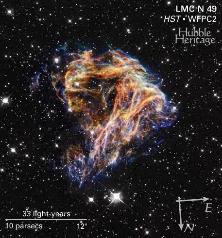 N49 হলো একটি টাইপ-২ সুপারনোভা বিস্ফোরণের ফলে তৈরি রেমন্যান্ট। এই সুপারনোভা রেমন্যান্ট N49 গ্যাস ও ধূলির বিশাল মেঘ যা সুপারনোভা বিস্ফোরণের সময় নিক্ষিপ্ত পদার্থ দ্বারা গঠিত হয়েছে এবং মহাকাশে ছড়িয়ে পড়েছে। মহাবিশ্বের নকল ছবির ভিড়ে আসল ছবি পাওয়াই দুষ্কর। কারণ মহাবিশ্বের যেসব ছায়াপথ, ব্লাকহোল, নক্ষত্রমণ্ডলির ছবি অনলাইনে ঘুড়ে বেড়ায় তার বেশিরভাগই কম্পিউটার জেনারেটেড ইমেজ। নাসা থেকে প্রকাশিত সুপারনোভা রেমন্যান্ট N49-এর এই ছবিটি হাবল স্পেস টেলিস্কোপ (HST)-এর ওয়াইড ফিল্ড প্ল্যানেটারি ক্যামেরা ২ ব্যবহার করে তোলা হয়েছে। এই রঙিন দৃশ্য হাবল স্পেস টেলিস্কোপে ধারণ করতে বিশেষ ফিল্টার ব্যবহার করে ধরা হয়েছে সালফার, অক্সিজেন ও হাইড্রোজেন গ্যাসের আলো। তারপর সেগুলো বসানো হয়েছে তারাভরা একটি সাদাকালো ছবির উপরে- যাতে মহাজাগতিক শিল্প যেন আরও প্রাণ পায়। পেছনের তারাদের ছবিও কিন্তু হাবল দিয়েই তোলা। এই N49 বিশেষভাবে গুরুত্বপুর্ণ কারণ এটি বৃহৎ ম্যাজেলানিক মেঘ বা Large Magellanic Cloud (LMC)-এ অবস্থিত যা আমাদের মিল্কিওয়ে গ্যালাক্সির খুব কাছের একটি স্যাটেলাইট গ্যালাক্সি। N49 হলো Large Magellanic Cloud-এ পাওয়া সবচেয়ে উজ্জ্বল সুপারনোভা রেমন্যান্ট। LMC একটি ডোয়ার্ফ গ্যালাক্সি যা মিল্কিওয়ের মহাকর্ষীয় টানে আবদ্ধ। যেটি পৃথিবী থেকে প্রায় ১,৬৩,০০০ আলোকবর্ষ দূরে। LMC- মহাকাশ বিজ্ঞানীদের কাছে কসমিক ল্যাবরেটরি কারণ এখানে আছে টারান্টুলা নেবুলা (30 Doradus) নামে বিশাল এক নক্ষত্র তৈরির অঞ্চল। নক্ষত্র কীভাবে জন্ম নেয়, বড় হয় এবং মারা যায় -এসব বুঝতে LMC-কে বিজ্ঞানীদের খুব দরকার। আর কবির দরকার নক্ষত্রের মৃত্যুকে এক মহাজাগতিক দীর্ঘশ্বাস মহাকাশে ছড়িয়ে দেয়ার জন্য। কারণ একটি নক্ষত্রের মৃত্যু থেকেই তো আরেকটি নক্ষত্র জন্ম নেয়।
