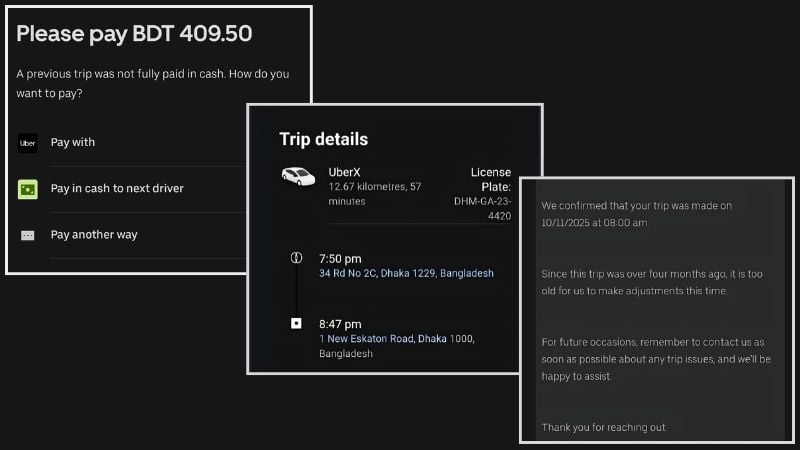 তিনি জানান, অ্যাপে প্রায় বিশটি ধাপ পেরিয়ে শেষ পর্যন্ত আপত্তি জানানোর অপশন পান তিনি। আপত্তি জানানোর তিন দিন পর উবার আরও তথ্য চেয়ে ই-মেইল পাঠায়। সে তথ্য দেওয়ার আরও তিন দিন পর পাঠানো জবাবে উবার জানায়— ট্রিপটি যে ২০২৪ সালের ১০ নভেম্বর হয়েছিল এবং নগদ পেমেন্ট অপশনেই লেনদেন হয়েছিল, তা নিশ্চিত হওয়া গেছে। তবে বকেয়া বিলের বিষয়ে কিছু করার নেই, কারণ ট্রিপটি চার মাসেরও আগের এবং এত পুরনো ট্রিপের সমাধান দেওয়ার ‘কারিগরি সক্ষমতা’ উবারের নেই। তাই এবারের মতো বিলটি পরিশোধ করে ভবিষ্যতে ট্রিপের তিন দিনের মধ্যে অভিযোগ জানানোর পরামর্শ দেওয়া হয়।